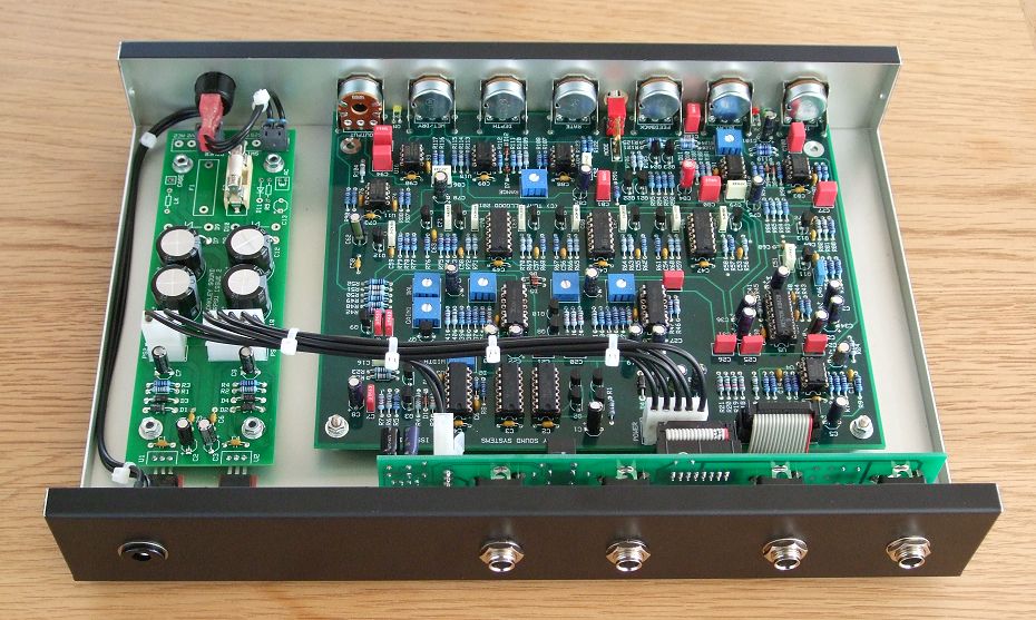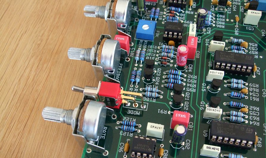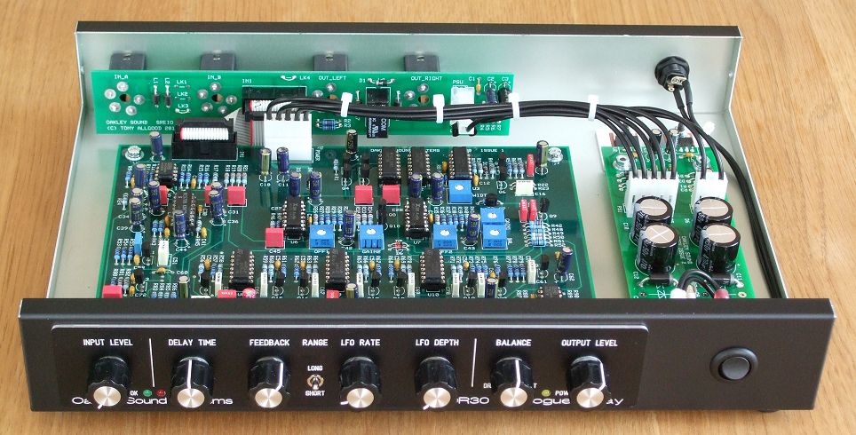 Two MN3005 re-issue BBDs provide the analogue delay pathway. A swtch on the front panel determines whether the signal runs through one or both BBD chips.