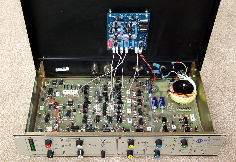 The DN-34 Analogue Time Processor effect was made by Klark Teknik™ in the late 1970s. It features two channels of analogue delay each capable of creating a delay from around 1mS to around 27mS. The delay time could be controlled from a front panel pot, an internal LFO with sine, triangle and square waveforms, and an external control voltage (CV). The two delays could be operated in series to give one longer delay or in parallel to create interesting effects such as through zero flanging. What was particularly good about the DN-34 was the very good sound quality available from the unit. Most BBD devices tend to be noisy and have limited bandwidth but the DN-34 excelled in both these areas.