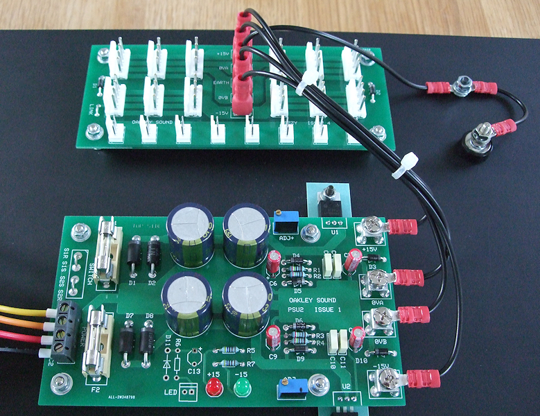 A single Dizzy board powered by an Oakley PSU2 module. Note the grounding bond and 4mm socket to the right of the Dizzy board.