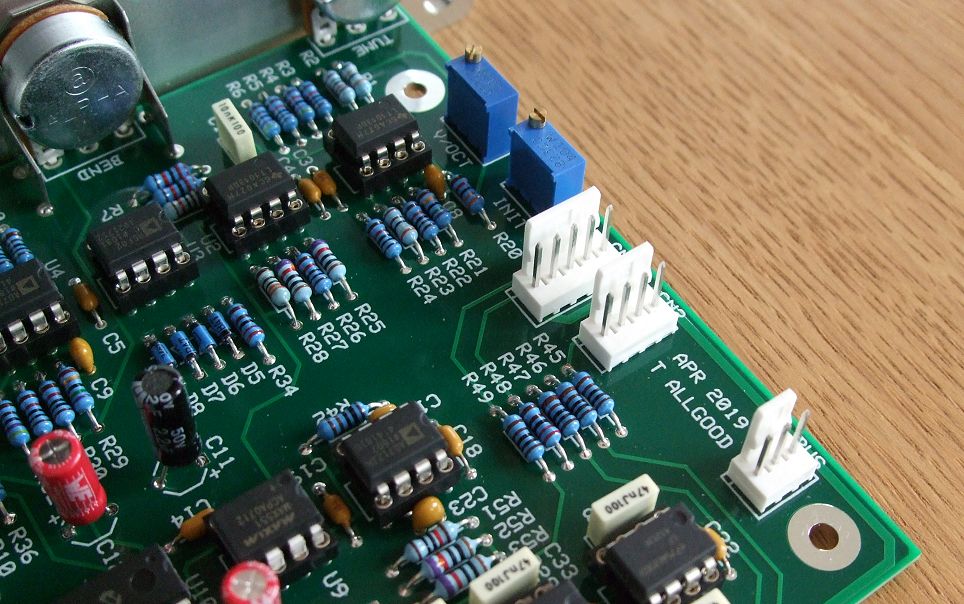 The control voltage, legato and gate outputs are available on two 0.1" headers at the top of the board. In addition is a three way header designed to connect to the Oakley Bus which transports KCV and gate to other modules.