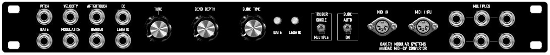 Pitch CV (Key CV): 128 steps of 12 bit accurate pitch voltage conforming to 1V/octave (trimmable). Pitch bend is added to this signal which can be adjusted via the bend depth control to give the maximum bend interval.