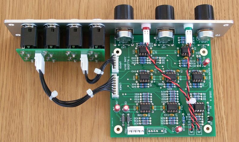 The Oakley Multimix issue 6 board behind a natural finish Schaeffer panel. Note the use of the optional Sock-8 board to make wiring the socket field much easier.