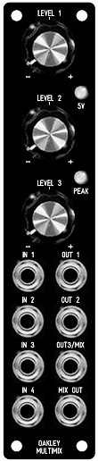A highly useful utility module. It's a four channel mixer with a twist. The first three inputs have each an independant level control. Each level control can be set so that the gain of the input is anything from -1.1 to +1.1. This means that not only can inputs be added together, but can subtract as well. With each input knob set to its middle position, then none or very little of the input signal will reach the output.
