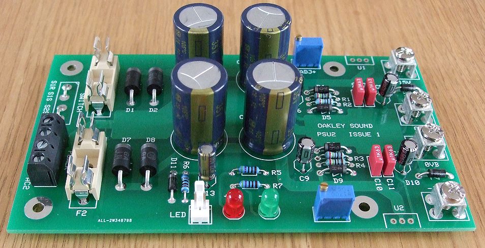 The Oakley PSU2 is a dual output +/-15V power supply based around the LM317 and LM337 regulators that is perfectly suited to powering a small to medium sized Oakley modular. Final output current capability is dependant on AC power source, the choice of smoothing capacitors and the heatsink used. However, with a suitable heatsink, capacitors and power source the Oakley PSU2 has been tested successfully at up to 1.2A per rail.