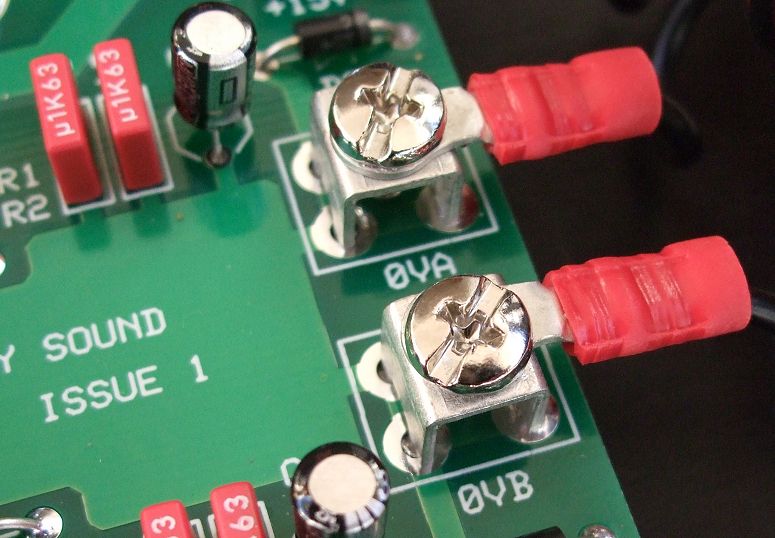 Chunky screw terminals are used for the PSU2's output connections. M4 ring terminals are crimped onto the connecting wires.