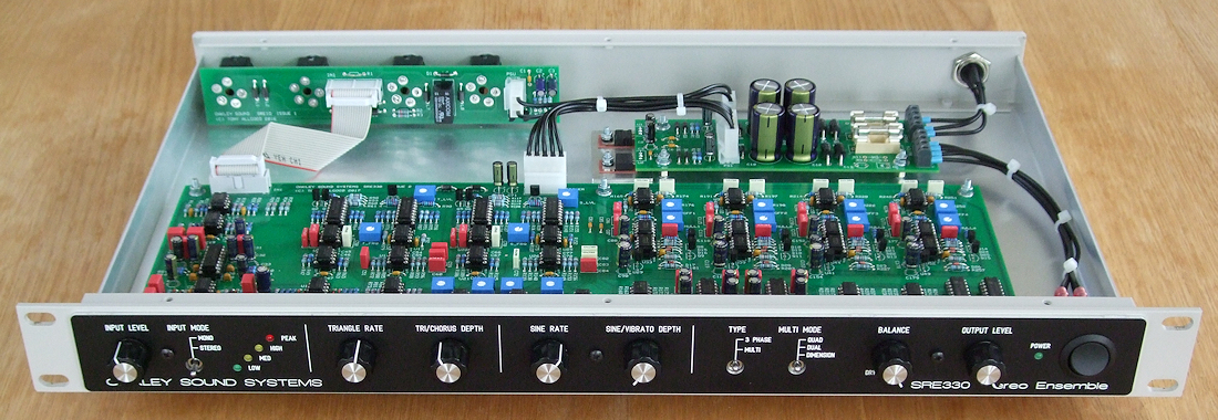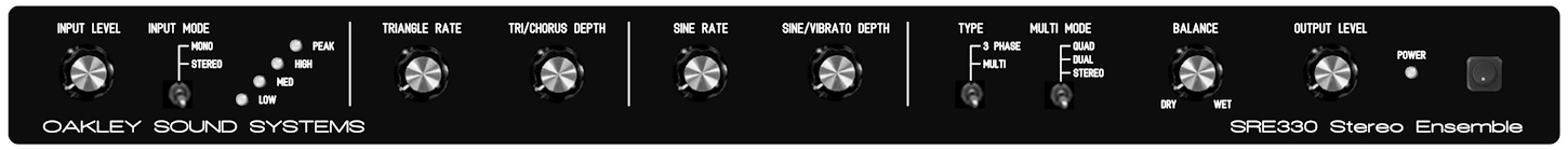 The Oakley SRE330 is a multi mode stereo ensemble unit designed to mimic the behaviour of the multichannel chorus and ensemble units of late 1970s and early 1980s. The SRE330 uses up to four channels of bucket brigade delay (BBD) lines and up to four voltage controlled low frequency oscillators (LFO) to achieve a sound reminiscent of various types of string machines, guitar chorus pedals and studio rack effects of yesteryear.